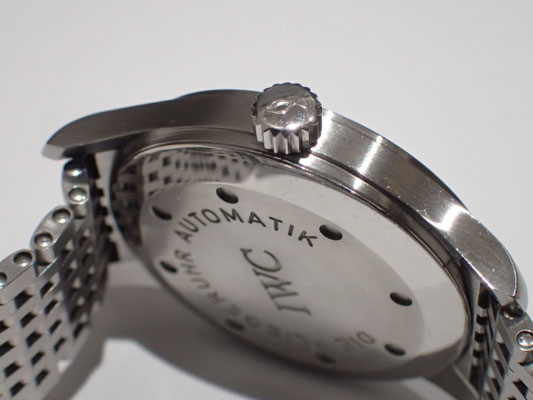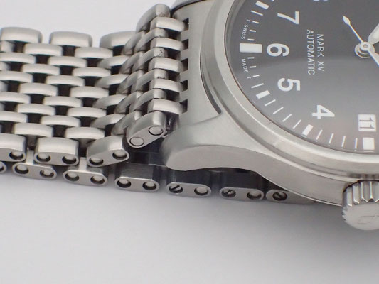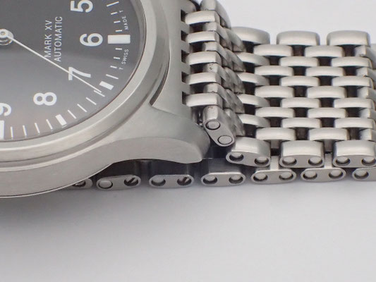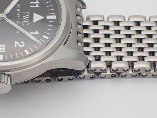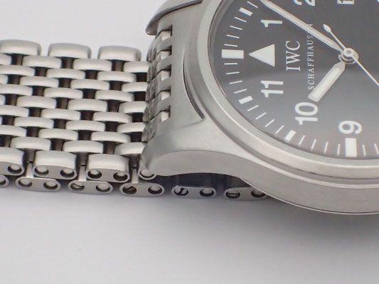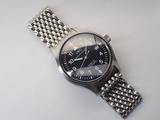 IWCマーク15品番3253.02が委託入荷。人気の初期「T」表記&11連ブレス仕様。マーク15はルクルトムーブを搭載したマーク12の後継として1999年頃市場投入された。マーク12とほぼ同じデザインを維持しながら、ケース径が36から38ミリへとサイズアップが図られ、文字盤、針、インデックス、レタリングも大きくなった。この品番は初期、中期、後期で仕様が変わる。初期は文字盤にトリチウムを意味する「T」表記&11連ブレス。革ブレス仕様もあってそちらは品番末尾が01。初期T表記は絶対数が極めて少ない。また11連ブレスはメーカーでの製造が終了しており単独の入手は極めて困難。中期は文字盤からT表記が消えてブレスは中期5連(駒丸み)。後期は黒文字盤の風防がブルーコーティングされ、ブレスは後期5連(駒台形)、派生として白文字盤、スピットファイア、日本限定なども有る。