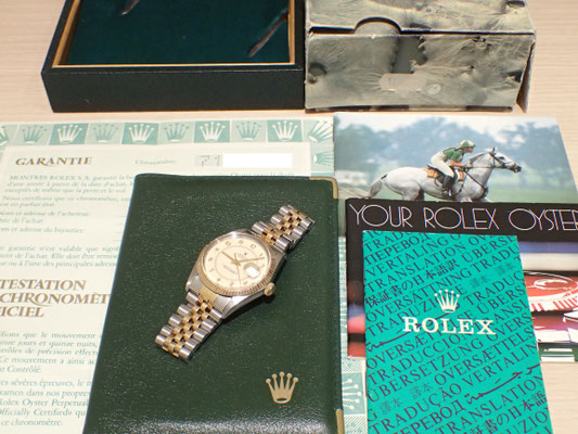 付属品:国際保証書 (イタリア 日付OP)、パスケース、DJ冊子 (eng1987)、オイスター冊子、内箱、外箱 (品番と文字盤色シールに擦れや剥がれ)