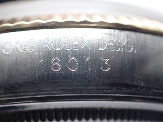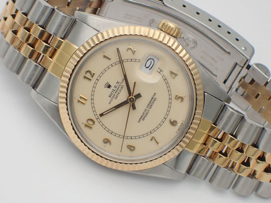 ロレックス・デイトジャスト16013が委託入荷。品番が5桁となった16013は1601/3の後継として1970年代後半に登場。デザイン面で大きな変化は無かったものの中身は大幅な進化を遂げた。ムーブメントはロレックスのメンズとしては初のハイビート28800振動、早送り機能搭載のキャリバー3035。末尾3が示すイエローゴールド製のフルーテッドベゼルにサイクロップレンズを備えたこのモデルは、特にその後期においては華やかだったバブル期の日本を象徴する時計となった。4桁の名残とも言うべきプラ風防&トリチウム夜光のためヴィンテージ感が色濃く残っており、令和の今も古き良き時代のロレックスとして中古市場で手堅い人気を誇っている。この文字盤はボイラーゲージダイヤルと呼ばれる。アプライドインデックスの内側の柄がボイラー外周と似ていることから命名された。今回のご案内品は経年により白文字盤がアイボリーに変色した希少なもの。
